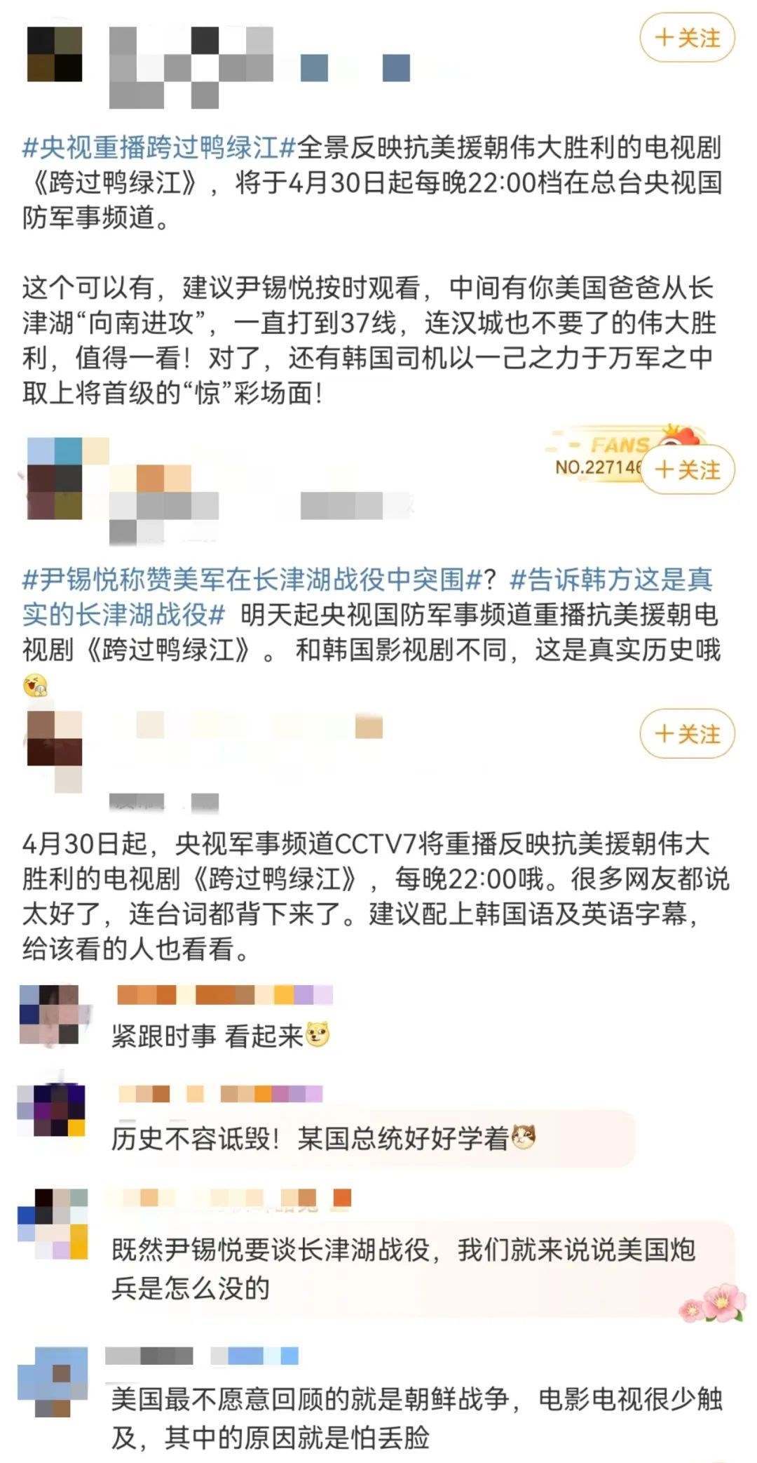4月29日,中央廣播電視總臺(tái)發(fā)布預(yù)告:電視劇《跨過(guò)鴨綠江》自4月30日起每晚22點(diǎn)檔在央視國(guó)防軍事頻道重播。
