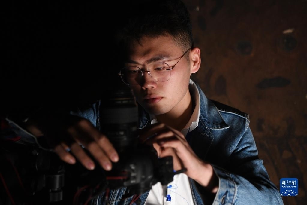 敦煌研究院文物數(shù)字化保護(hù)團(tuán)隊圖像采集人員熊業(yè)騰在洞窟內(nèi)調(diào)試設(shè)備,準(zhǔn)備進(jìn)行壁畫圖像采集(4月25日攝)。