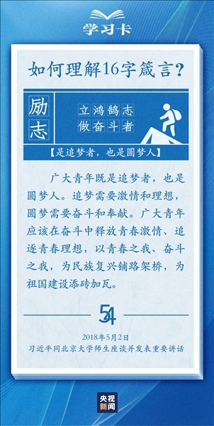 青春,是人生最美的時光。青年,是國家的未來和民族的希望。每每與青年對話,習近平總書記無不囑托青年“立大志”“堅定理想信念”“擔當復(fù)興大任”,言之諄諄,意之殷殷。對于新時代青年如何走好人生路,習近平總書記2018年提出十六字箴言,字短意長。今天,一起學(xué)習↓