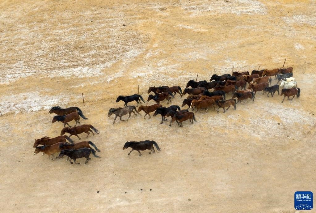 5月3日,在阿克塞縣阿伊納鄉(xiāng)海子草原,馬群轉(zhuǎn)場(chǎng)去往夏季牧場(chǎng)(無(wú)人機(jī)照片)。