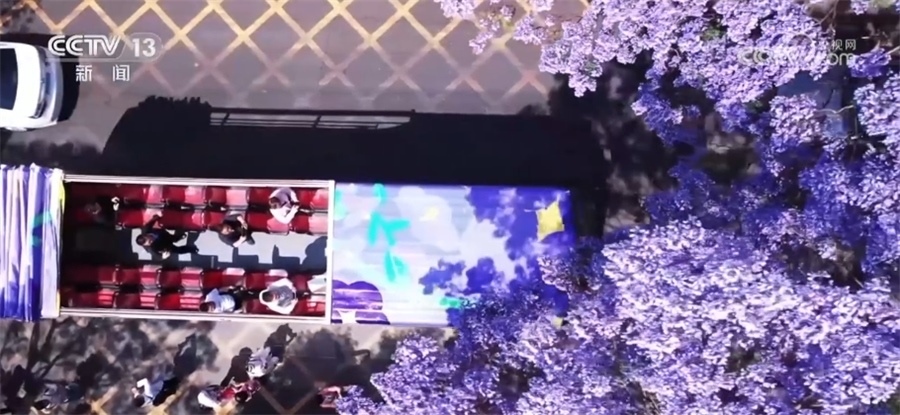總臺記者 郭琳潔:我現(xiàn)在是在昆明的教場中路,5月上旬,道路兩側的藍花楹競相綻放,將這條1.4公里長的道路裝扮成一條紫色長廊。