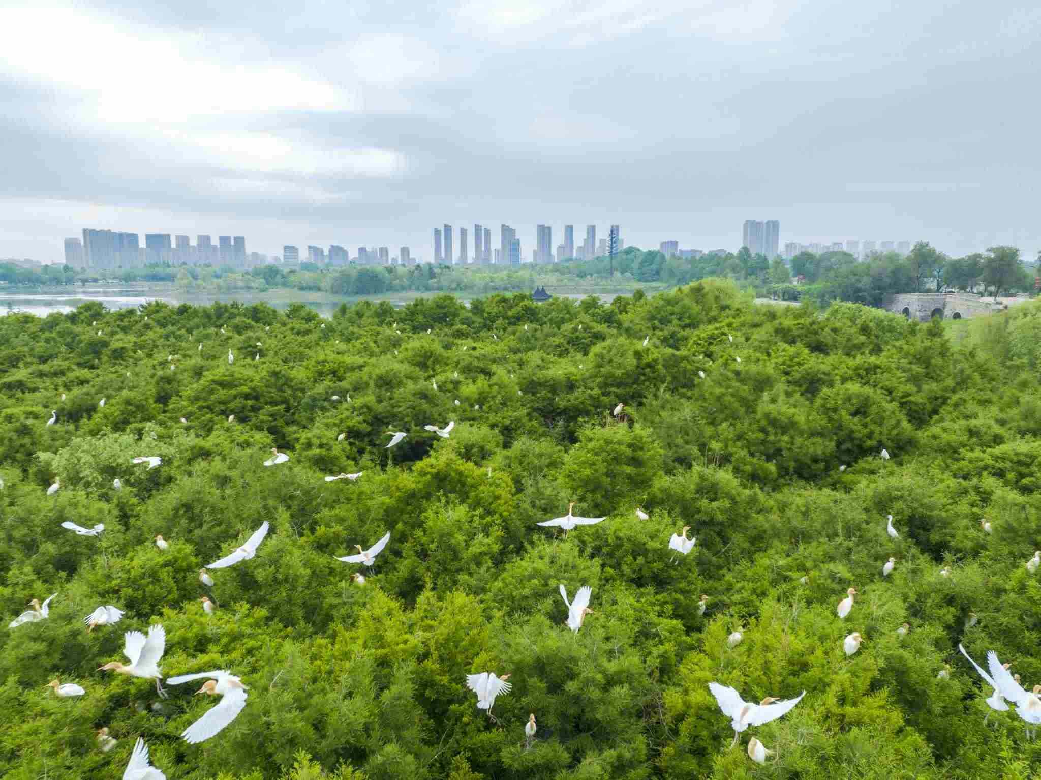 2023年5月11日,江蘇連云港,東??h西雙湖濕地公園,上千只鷺鳥前來棲息繁衍。視覺中國