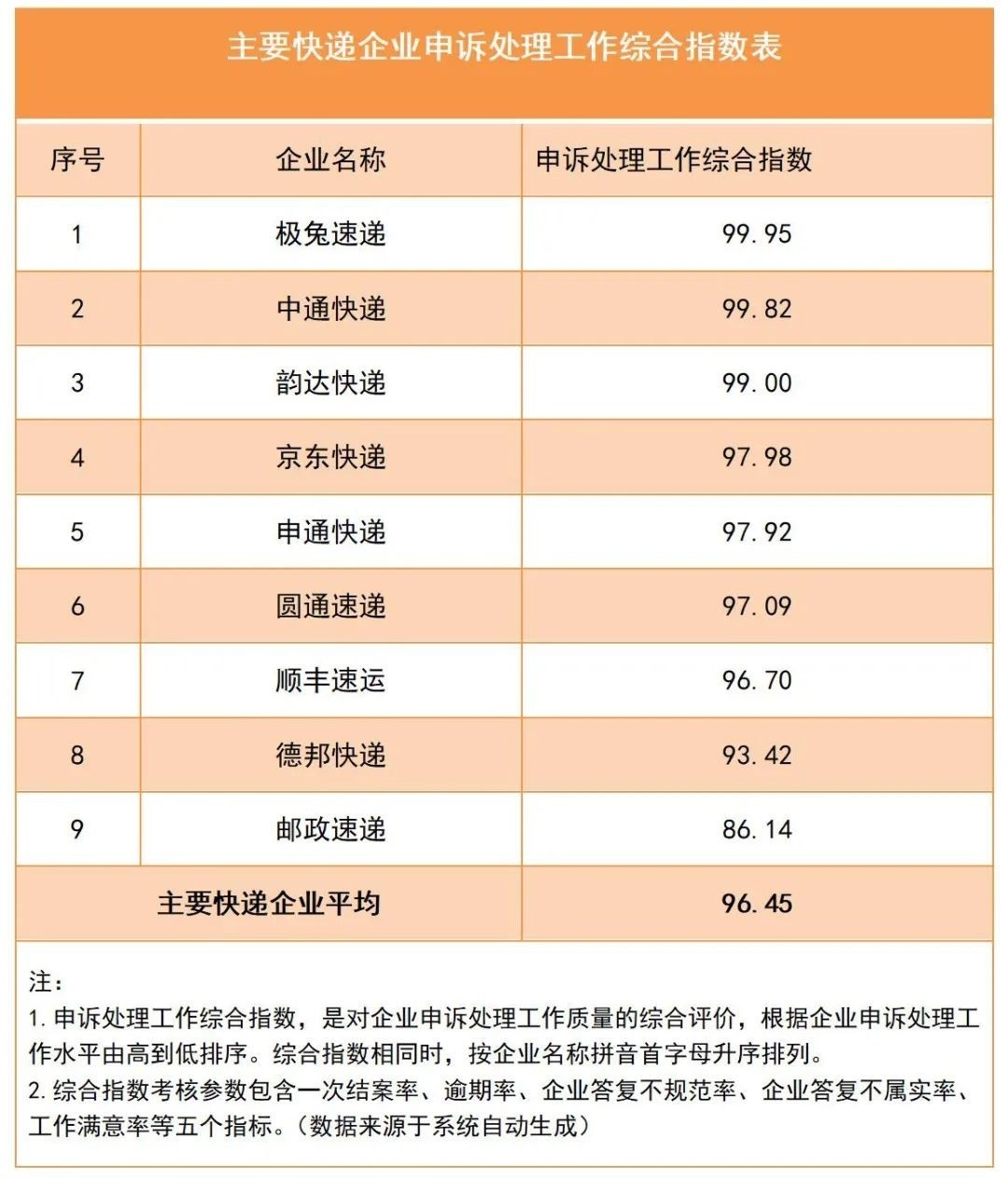 主要快遞企業(yè)申訴處理工作綜合指數(shù)情況