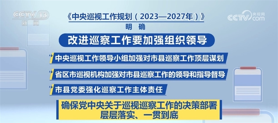 《中央巡視工作規(guī)劃(2023—2027年)》明確,改進(jìn)巡察工作要加強組織領(lǐng)導(dǎo)。中央巡視工作領(lǐng)導(dǎo)小組加強對市縣巡察工作頂層謀劃,省區(qū)市巡視機構(gòu)加強對市縣巡察工作的領(lǐng)導(dǎo)和指導(dǎo)督導(dǎo),市縣黨委強化巡察工作主體責(zé)任,確保黨中央關(guān)于巡視巡察工作的決策部署層層落實、一貫到底。