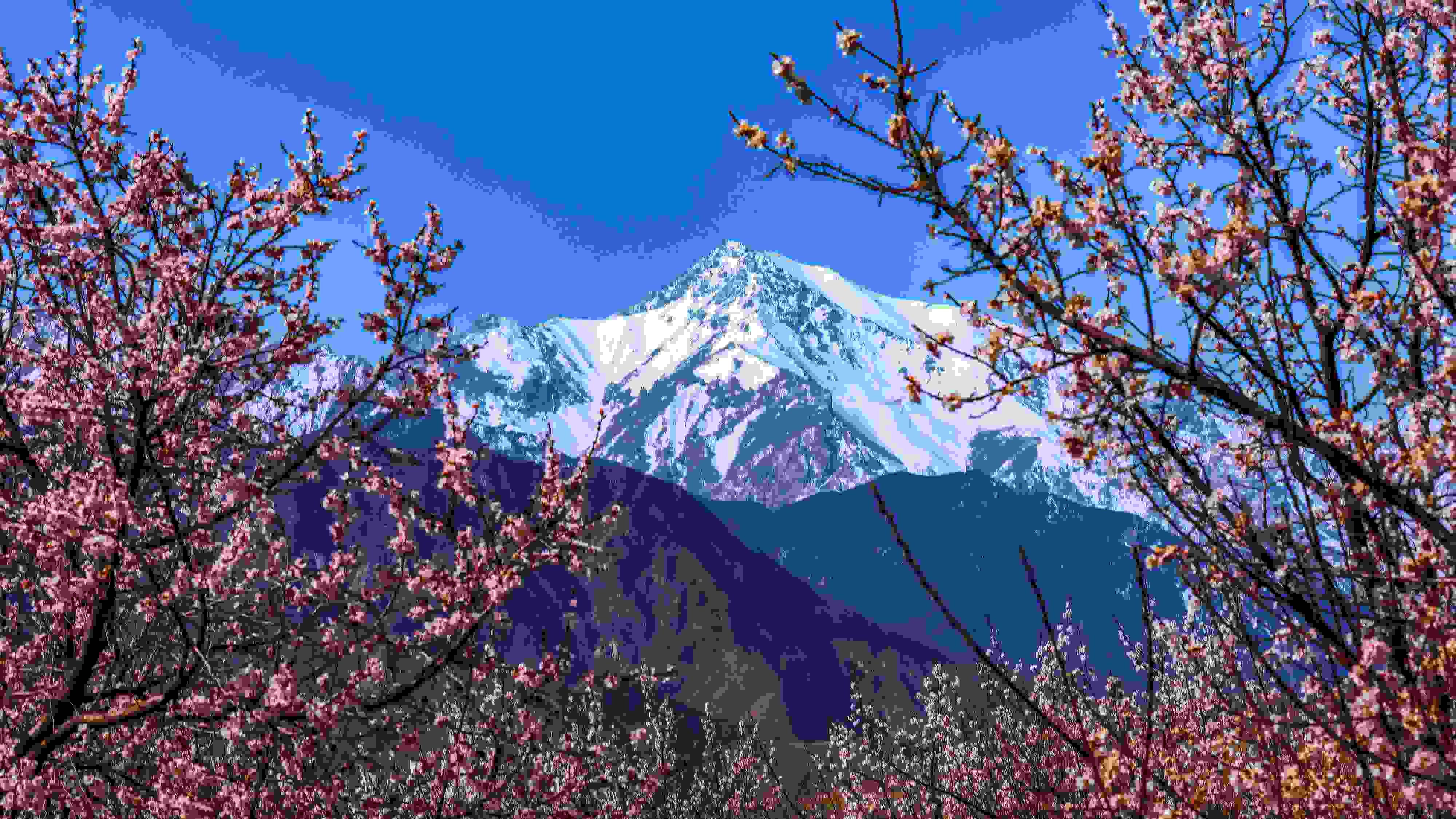 2023年5月14日,甘肅張掖,高臺縣新壩鎮(zhèn),千畝杏林繁花似錦與藍天、雪山交相輝映,把初夏的祁連山區(qū)裝扮得分外美麗。 視覺中國