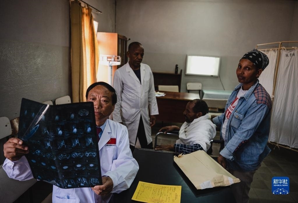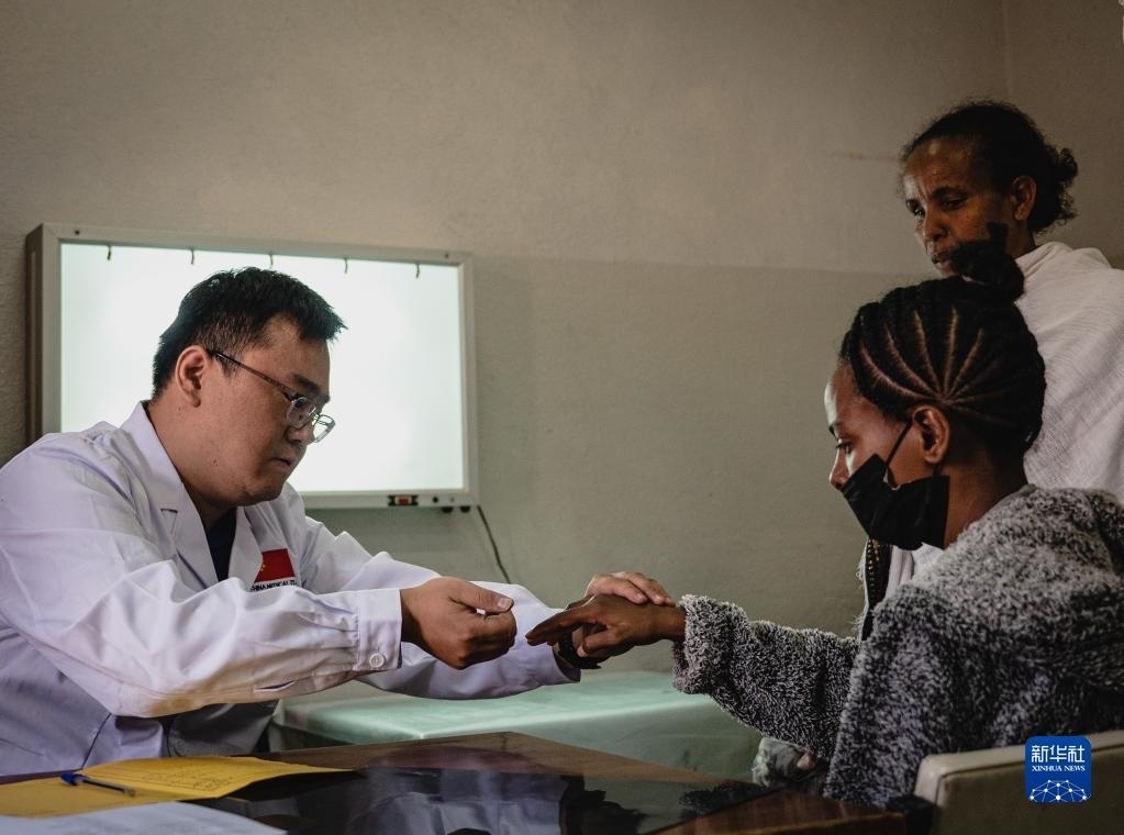 5月9日,在厄立特里亞首都阿斯馬拉的哈利貝特醫(yī)院,醫(yī)療隊(duì)脊柱外科醫(yī)生周大凱(中)為患者做檢查。