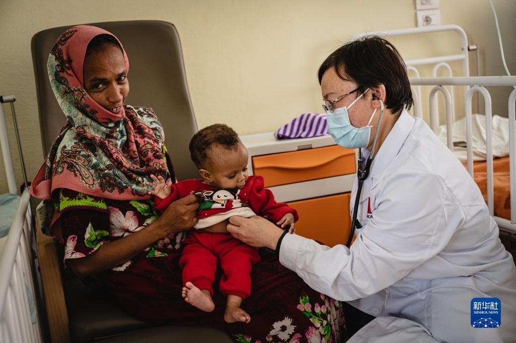 5月9日,在厄立特里亞首都阿斯馬拉的奧羅特醫(yī)院,醫(yī)療隊(duì)兒科醫(yī)生張春燕(右)為小朋友聽(tīng)診。