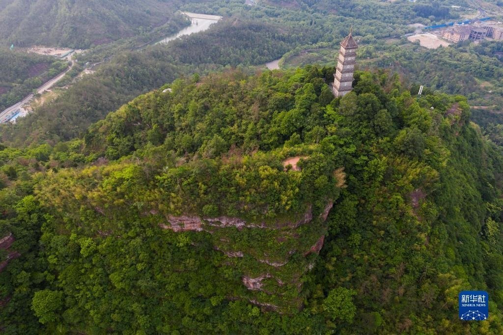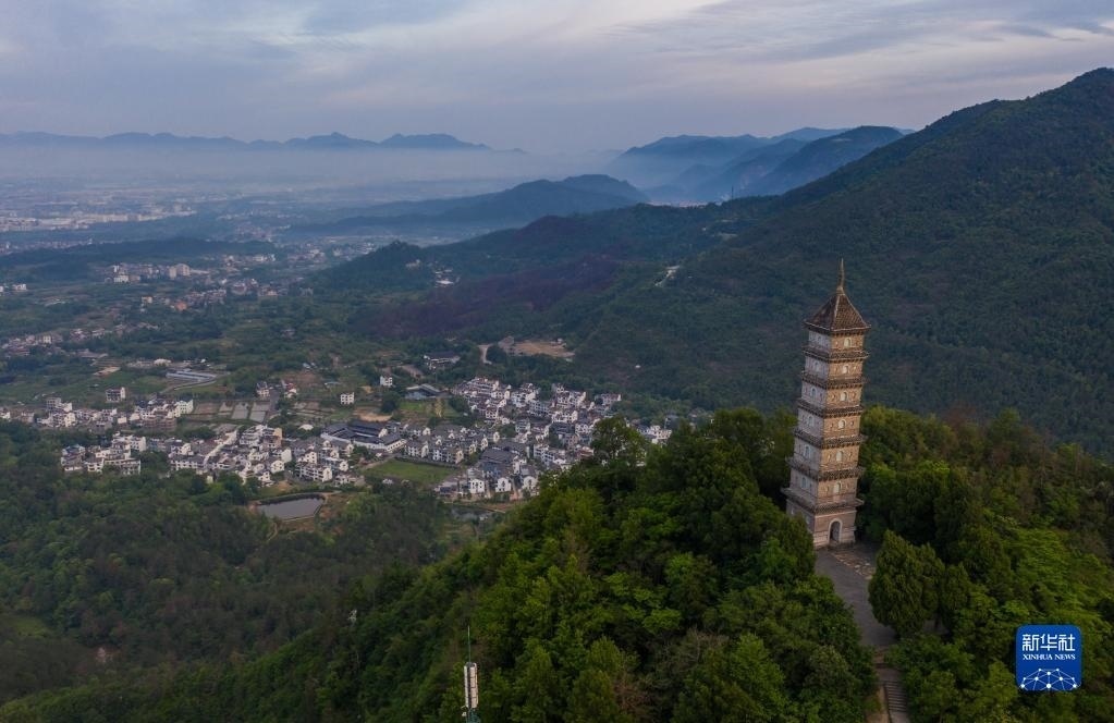 俯瞰天臺縣的赤城山及山頂?shù)牧哄?月16日攝,無人機(jī)照片)。