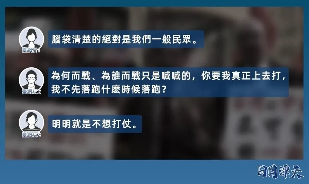 譚主一位來(lái)自新北的青年朋友小章說(shuō),他服四個(gè)月義務(wù)兵役時(shí)“每天都想要逃離”,服完役才感到解脫,那段時(shí)間的心情就是“來(lái)不及了快下車(chē)”“民進(jìn)黨就是‘臺(tái)獨(dú)’啊,我不想去給他們當(dāng)炮灰”。