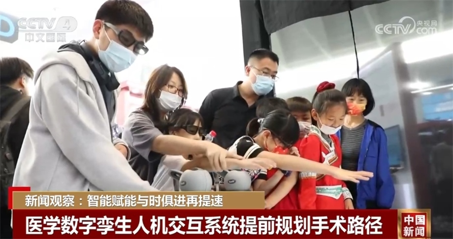 展會(huì)上,科研人員設(shè)計(jì)了一套基于全息現(xiàn)實(shí)的醫(yī)學(xué)數(shù)字孿生人機(jī)交互系統(tǒng),通過對(duì)患者數(shù)據(jù)進(jìn)行建模,在投影的孿生人上生成血管、器官等重要組織結(jié)構(gòu),輔助醫(yī)生進(jìn)行手術(shù)的路徑規(guī)劃。