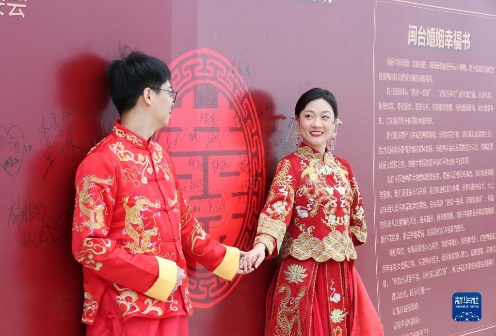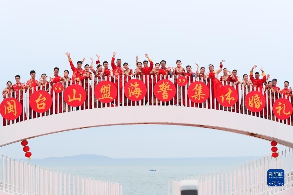 當(dāng)日,一場以“愛情恒久遠(yuǎn)、幸福長相伴”為主題的閩臺(tái)“山盟海誓”集體婚禮暨2023年閩臺(tái)婚姻家庭交流活動(dòng)在福建省福州市平潭縣舉辦。21對閩臺(tái)新人身穿紅色中式婚服,手牽紅繡球,行跨火盆、踩瓦片、扎繡球和“合茶”、“合巹”、“海誓”等閩臺(tái)傳統(tǒng)結(jié)婚禮儀,結(jié)下跨越海峽的姻緣。