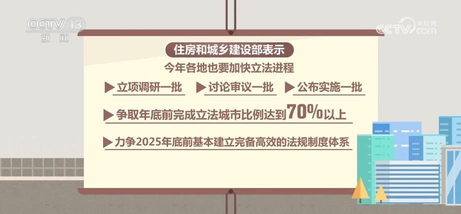 住房城鄉(xiāng)建設(shè)部表示,2023年,各地也要加快立法進程,立項調(diào)研一批、討論審議一批、公布實施一批,爭取年底前完成立法城市比例達到70%以上,力爭2025年底前基本建立完備高效的法規(guī)制度體系。