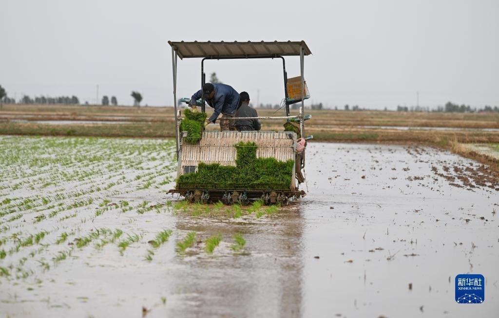 5月23日,達(dá)拉特旗昭君鎮(zhèn)村民在鹽堿地改良水稻田中使用農(nóng)機(jī)插秧。