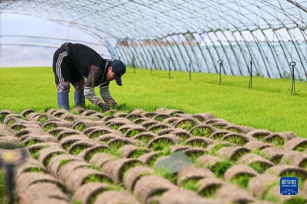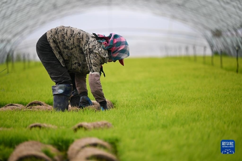 5月23日,達(dá)拉特旗昭君鎮(zhèn)村民在育秧苗大棚中起秧。