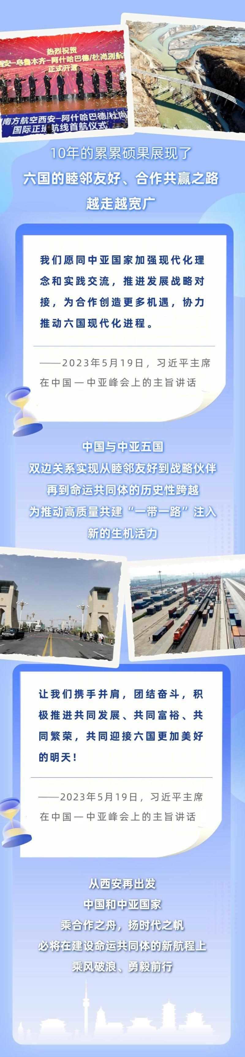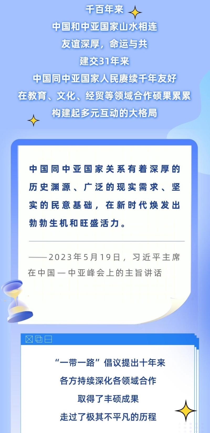 從去年1月的建交30周年視頻峰會,到今年這次中國—中亞峰會,習近平主席同中亞五國元首連續(xù)兩年集體會晤,并正式成立中國—中亞元首會晤機制,為中國—中亞關系發(fā)展作出戰(zhàn)略領航。下面,讓我們一起通過習近平主席的重要講話,回顧中國與中亞國家源遠流長的友誼、極其不凡的合作歷程,讀懂中國—中亞峰會的重要意義。