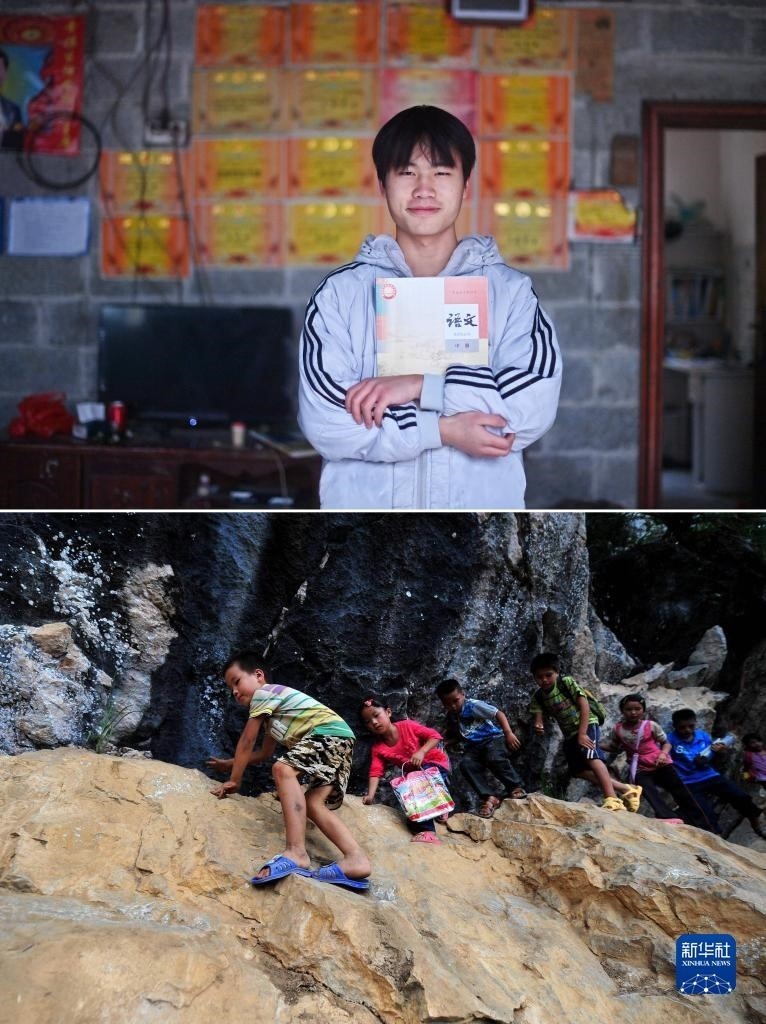 拼版照片:上圖為2023年1月26日,在大化瑤族自治縣板升鄉(xiāng)弄雷村,大化瑤族自治縣高級中學(xué)高二學(xué)生蒙文超站在家里,身后的墻上貼滿獎(jiǎng)狀;下圖為2012年9月5日,在大化瑤族自治縣板升鄉(xiāng)弄雷村,7歲的蒙文超(左一)放學(xué)后爬懸崖回家。今年18歲的蒙文超最大的夢想是一年后考上理想的大學(xué)。