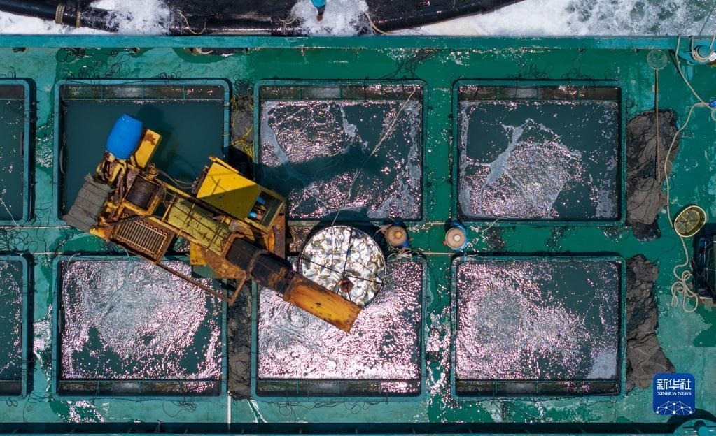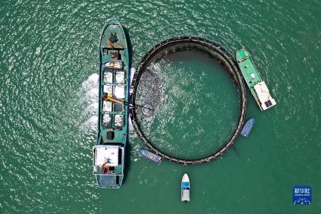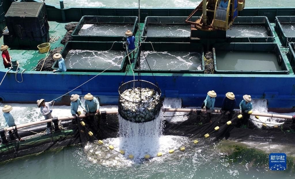5月27日,在湛江市徐聞縣西連鎮(zhèn),漁業(yè)工人從徐聞國橋深海養(yǎng)殖有限公司的金鯧魚深海網(wǎng)箱捕魚(無人機照片)。