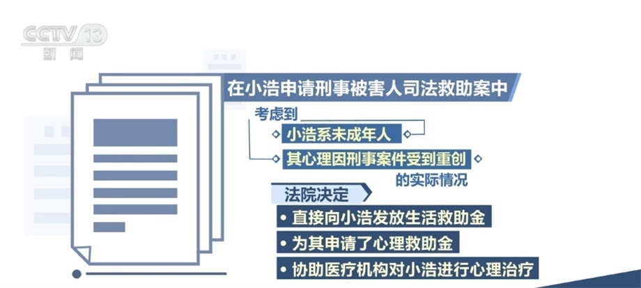 在此次發(fā)布的保護(hù)未成年人權(quán)益司法救助典型案例中,還涉及針對(duì)向未成年人提供專(zhuān)門(mén)心理救助金、提供心理危機(jī)干預(yù)等立體幫扶,進(jìn)一步延伸司法服務(wù)。在小浩申請(qǐng)刑事被害人司法救助案中,小浩的父親被害,其本人亦受到人身傷害,法院作出刑事附帶民事判決,判處被告人死刑,并判決其賠償附帶民事訴訟原告人經(jīng)濟(jì)損失13萬(wàn)余元。后經(jīng)調(diào)查,被告人無(wú)財(cái)產(chǎn)可供執(zhí)行。考慮到小浩系未成年人,其心理因刑事案件受到重創(chuàng)的實(shí)際情況,法院除決定直接向小浩發(fā)放生活救助金外,還為其申請(qǐng)了心理救助金,協(xié)助醫(yī)療機(jī)構(gòu)對(duì)小浩進(jìn)行心理治療。