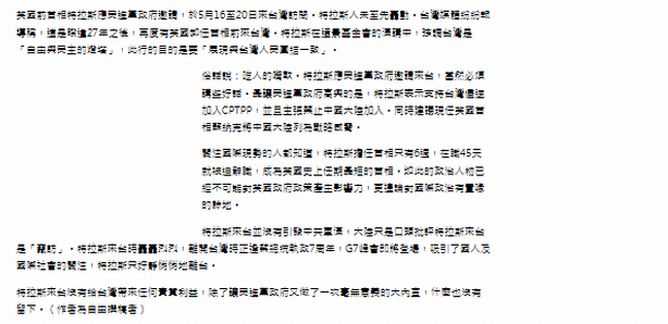 譚主檢索了與特拉斯竄臺(tái)相關(guān)的島內(nèi)媒體報(bào)道,發(fā)現(xiàn)一個(gè)很有代表性的質(zhì)問(wèn):“對(duì)于這么一個(gè)失敗、短命、在政壇喪失影響力的前首相,你們還在天真地認(rèn)為她竄臺(tái)對(duì)臺(tái)灣有好處嗎?”