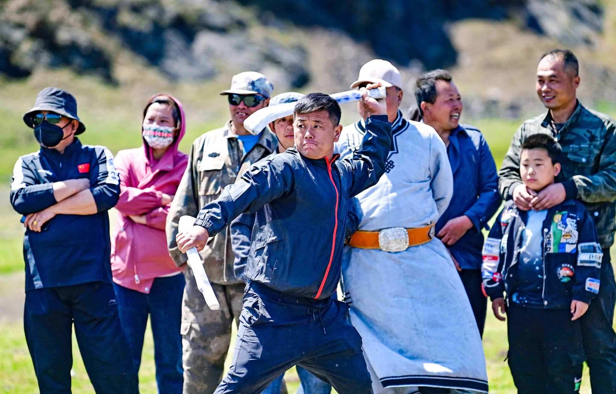 2023年5月26日,內(nèi)蒙古興安盟,科爾沁右翼前旗德伯斯鎮(zhèn)阿日林一合嘎查舉行首屆那達慕,設置的賽馬、布魯、搏克、拔河等傳統(tǒng)體育娛樂項目,吸引嘎查周邊500余名牧民參加比賽,喜慶牧業(yè)豐收季。視覺中國