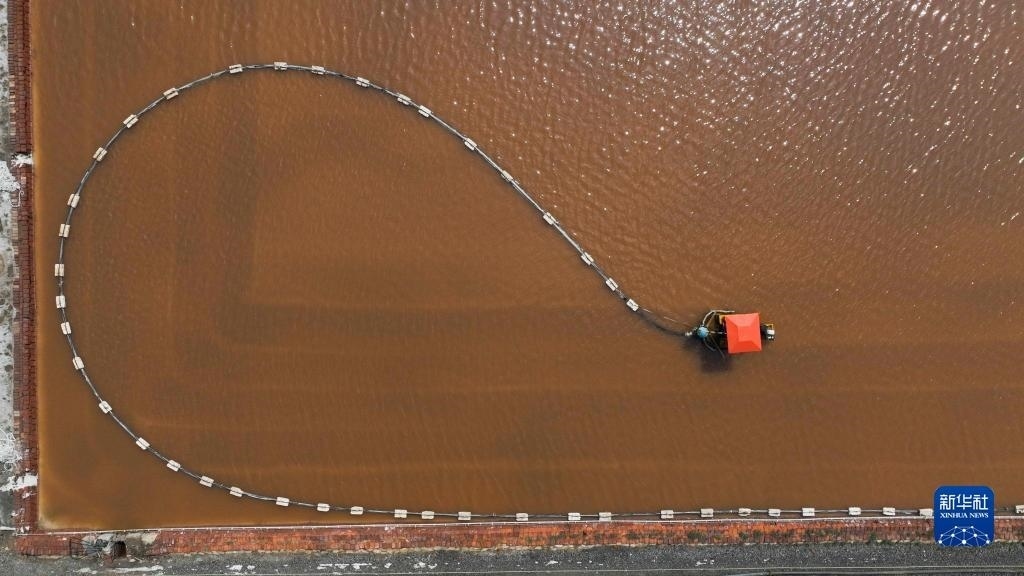 6月4日,工人操作設(shè)備在唐山海港經(jīng)濟(jì)開發(fā)區(qū)長(zhǎng)蘆大清河鹽場(chǎng)收獲海鹽(無人機(jī)照片)。