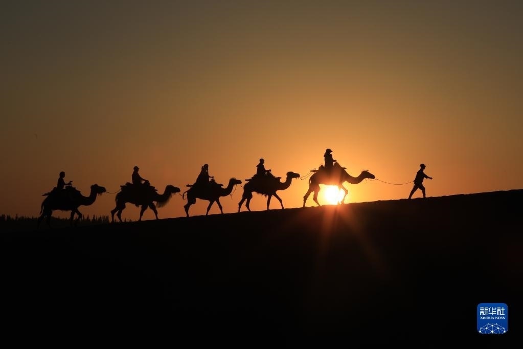 6月7日清晨,在甘肅敦煌鳴沙山月牙泉景區(qū),游客騎乘駱駝感受大漠風(fēng)光。