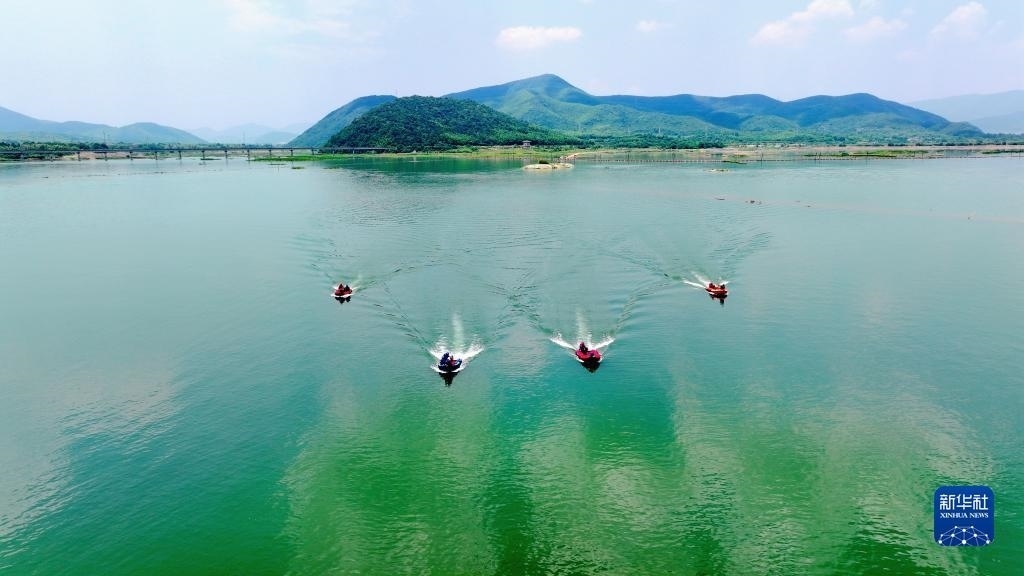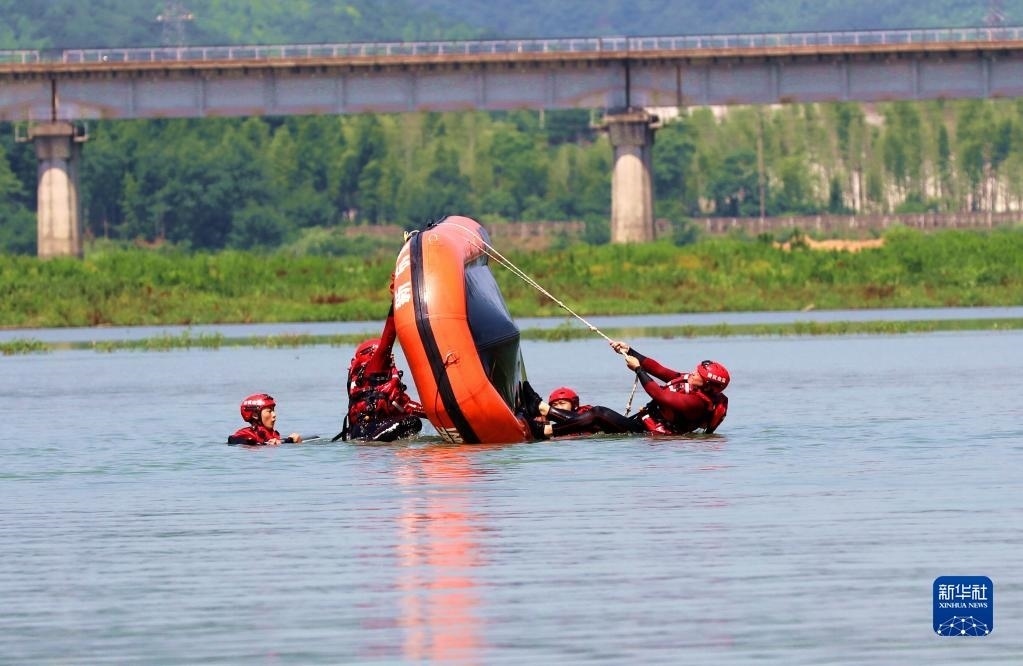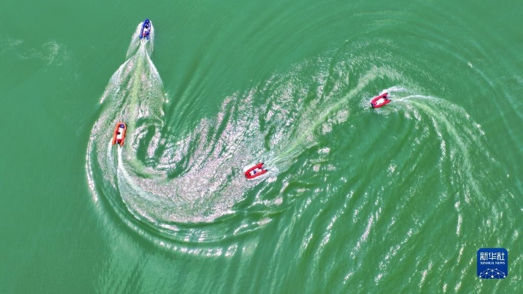 當日,在浙江省湖州市長興縣合溪水庫煤山段,煤山鎮(zhèn)組織黨員干部、應(yīng)急管理隊員、志愿者組成應(yīng)急救援隊,開展防汛減災(zāi)應(yīng)急綜合實戰(zhàn)演練,通過沖鋒舟編隊、水上打撈、水上救援等課目訓練,增強防汛應(yīng)急處置和水上搶險救災(zāi)能力。新華社發(fā)(許旭 攝)