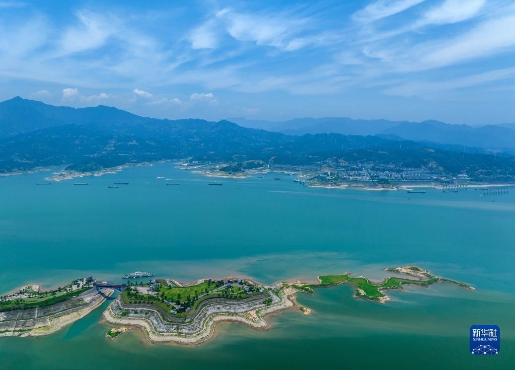 6月10日,船舶從湖北省宜昌市秭歸縣木魚島外沿水域駛過(無人機照片)。   新華社發(fā)(王罡攝)