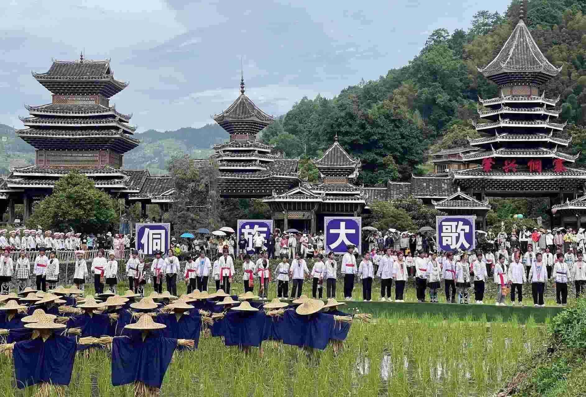 2023年6月10日,侗族同胞在貴州省黎平縣肇興侗寨田園實景展示侗族大歌。 (寧堅 鄧永生)