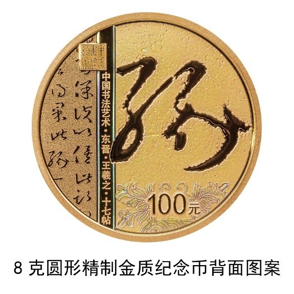 8克圓形金質(zhì)紀念幣背面圖案為東晉王羲之書《十七帖》局部文字及“緣”字樣與裝飾紋樣、“中國書法藝術”篆刻鈐印等組合設計,并刊“中國書法藝術·東晉·王羲之·十七帖”字樣及面額。