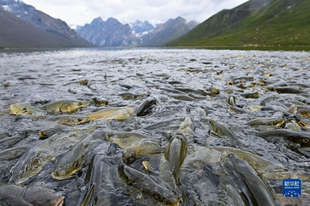 6月11日,在青海省果洛藏族自治州久治縣境內(nèi)的年保玉則,裸鯉在水中活動(dòng)。