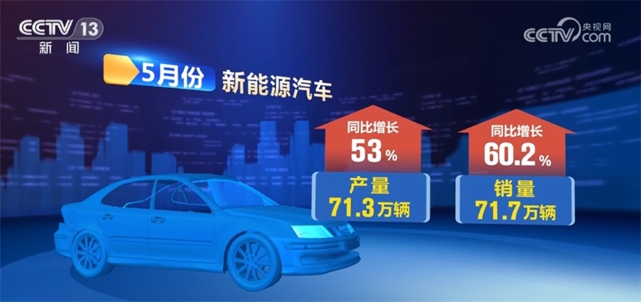 其中,新能源汽車產(chǎn)銷量分別完成71.3萬輛和71.7萬輛,同比分別增長53%和60.2%,市場(chǎng)占有率達(dá)到30.1%。在出口方面,5月份,全國汽車出口38.9萬輛,同比增長58.7%。