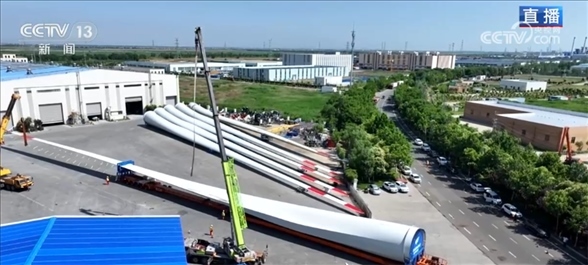 總臺央視記者 古峻嶺:我現(xiàn)在就在連云港生產(chǎn)超長風(fēng)電葉片的這個廠區(qū)。我身后就是這場直播連線的主角——長達(dá)123米的超長海上風(fēng)電葉片,像這樣的葉片一共有3支,我們可以看到此刻它已經(jīng)完成了正式安裝前的所有檢測工作,剛剛吊裝到一輛65米長的專用平板運輸車上,即將開啟陸地轉(zhuǎn)運的第一步。