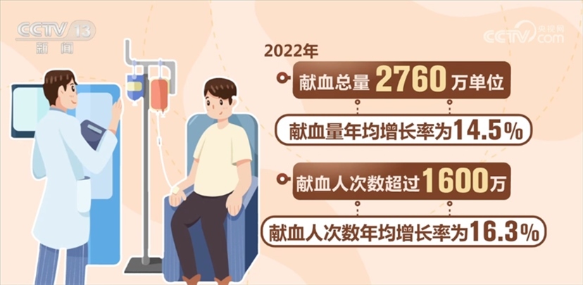 國家衛(wèi)生健康委相關負責人表示,我國無償獻血工作目前已形成了“政府主導、部門協(xié)作、社會支持、公眾參與”的格局,無償獻血制度全面建立,血液管理制度和規(guī)范標準體系不斷完善。全國建立了橫向到邊、縱向到底的血站采供血服務體系。全國共建設血站453家,形成以省級血液中心為龍頭、地市級中心血站為主體、中心血庫為補充的血站服務體系。我國血液安全保障水平大幅提升。全國無償獻血人次數和獻血量實現(xiàn)20多年持續(xù)增長,千人口獻血率由1998年的4.8提升至2022年11.5,2022年獻血總量2760萬單位,獻血量年均增長率為14.5%。2022年獻血人次數超過1600萬,獻血人次數年均增長率為16.3%。今年1—5月,獻血人次數和獻血量比去年同期增長7.7%和6%。