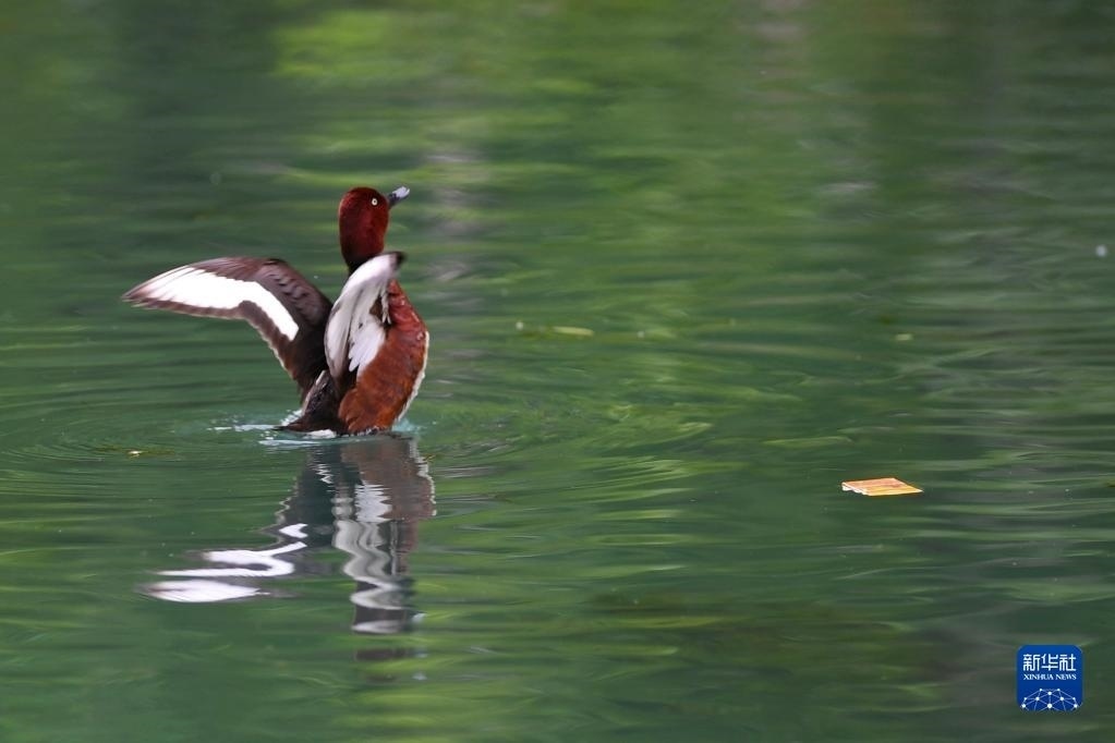 夏日里,白眼潛鴨和鳳頭潛鴨在西藏拉薩市拉魯濕地國(guó)家級(jí)自然保護(hù)區(qū)中干渠里覓食、嬉戲。新華社記者 張汝鋒 攝