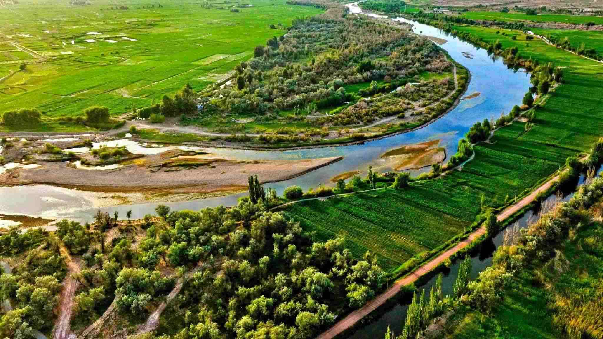 2023年6月15日,甘肅省張掖市,甘州區(qū)靖安鄉(xiāng)、臨澤縣板橋鎮(zhèn)境內(nèi)的黑河兩岸,寬闊的河床、彎曲的河流、農(nóng)作物以及樹木、蘆葦、濕地在夕陽(yáng)的映照下綠意盎然。視覺中國(guó)