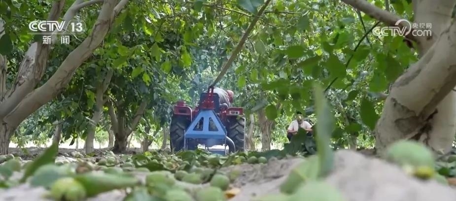 總臺記者 卜鵬:這里是位于新疆阿克蘇地區(qū)溫宿縣的一處核桃種植基地,這段時間正是當?shù)睾颂页墒觳烧募竟?jié)。這些核桃樹上,一顆顆青綠渾圓的核桃掛滿枝頭,而在核桃樹底下,當?shù)氐墓r(nóng)們正在抓緊撿收被抖落的核桃。為什么說是被抖落的核桃而不是被敲落的核桃?那是因為,在當?shù)匾恍┓N植面積比較大的核桃基地里,當?shù)氐墓r(nóng)會選擇利用農(nóng)業(yè)機械輔助抖動樹干的方式來采收核桃。采收的時候,果農(nóng)們會把繩索捆綁在核桃樹上,負責機械操作的師傅會根據(jù)樹枝的粗細來掌握和控制抖動的力度,這樣就能夠避免因為用力過猛而對樹枝產(chǎn)生傷害。經(jīng)過機器的搖擺,核桃就會接二連三落在地上,相比于人工采摘,機械采摘的方式效率會更高。
