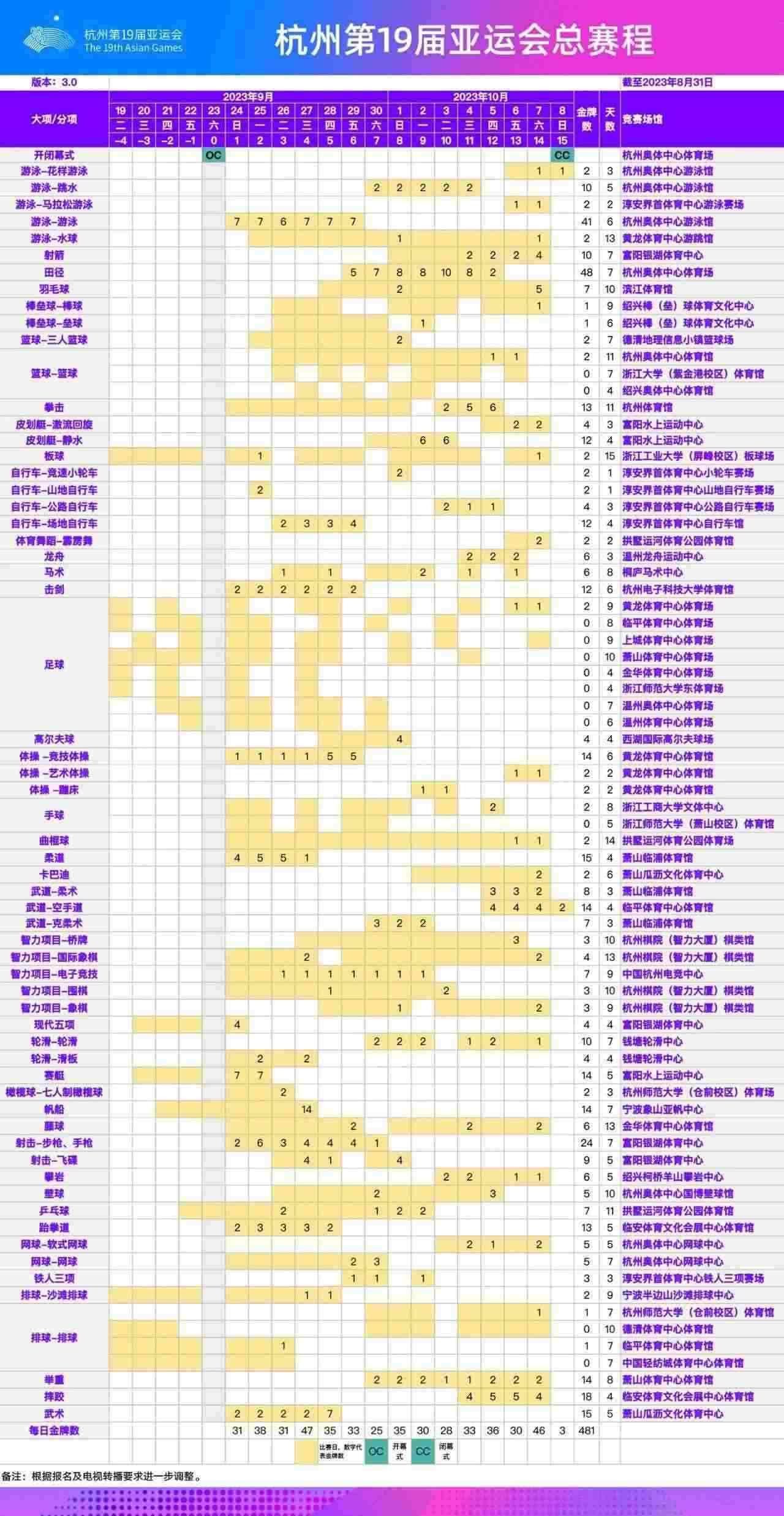 根據(jù)最新報名調(diào)整情況,經(jīng)杭州亞運會各項目技術(shù)代表確認,杭州亞運會總賽程已更新至3.0版。