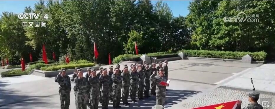 在黑龍江省虎林市第二次世界大戰(zhàn)終結(jié)地紀(jì)念園,入伍新兵面向軍旗、高舉右拳,向軍旗宣誓,以此向英雄致敬。在紀(jì)念碑前,全體人員整齊列隊(duì),肅立脫帽,向逝者默哀,并敬獻(xiàn)花籃。