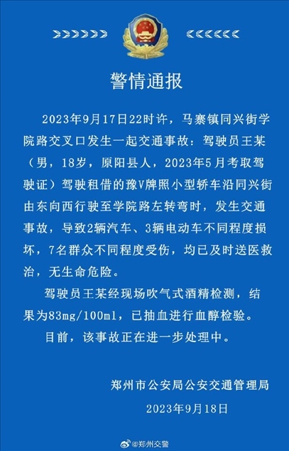·鄭州警方通報18歲男子醉駕致7人傷,肇事者剛領(lǐng)駕照4個月。