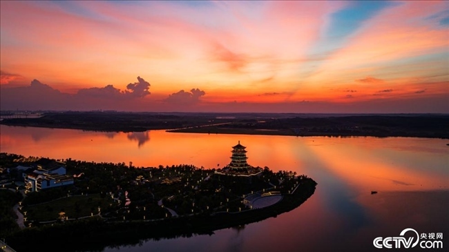 江西吉安,夕陽西下,漫天霞光映紅江面。