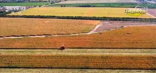 從和田市吉亞鄉(xiāng)上空俯瞰,沃野千里,一片金黃,一臺(tái)臺(tái)收割機(jī)正在忙著收玉米。今年,當(dāng)?shù)厥状瓮度肴詣?dòng)大型玉米收割機(jī),可以做到收割、剝皮、去芯、分離、脫粒一氣呵成,一次可以收割十四行玉米,大大提高了作業(yè)效率。
