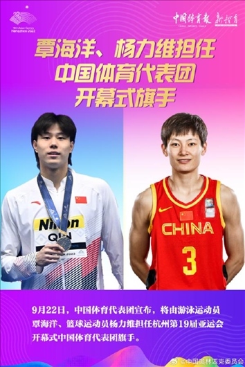 9月22日上午,中國體育代表團宣布,將由游泳運動員覃海洋、籃球運動員楊力維擔(dān)任杭州亞運會開幕式中國體育代表團旗手。