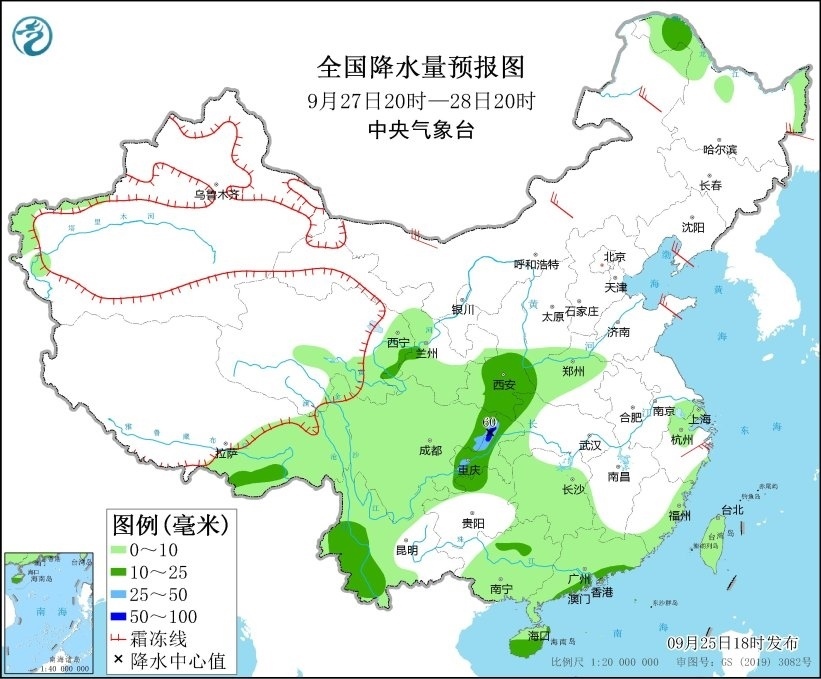 9月25日20時(shí)至26日20時(shí),廣東西南部、廣西南部、海南島以及新疆北疆北部、西藏東南部、陜西南部等地部分地區(qū)有中到大雨,其中,海南島東部和南部等地部分地區(qū)有暴雨或大暴雨(100~180毫米)。另外,新疆阿勒泰山區(qū)有雨夾雪或雪。內(nèi)蒙古中西部、山東半島等地部分地區(qū)有4~6級(jí)風(fēng)(見圖1)。