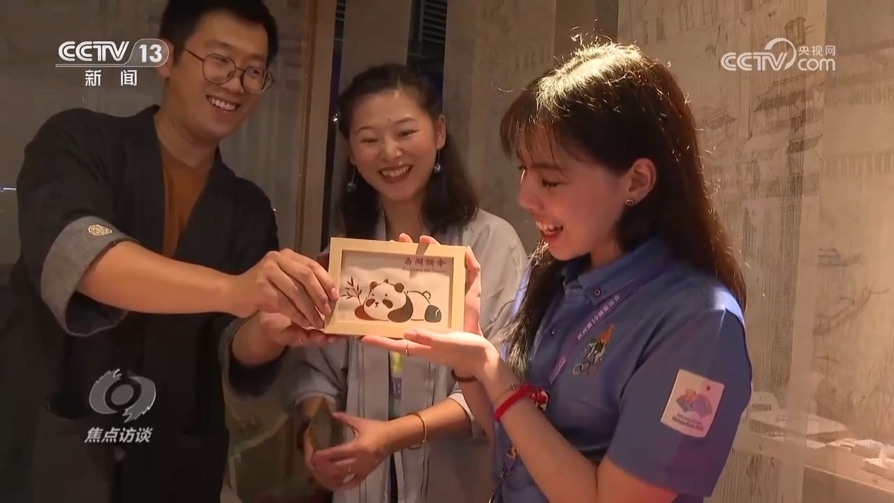 村里的文化市集里同樣熱鬧非凡,竹編、剪紙、皮影戲……每一個展位面前都圍著不少外國運動員。來自泰國的擊劍運動員正在體驗綢傘刷花。在刷子涂上顏料,再和絲網(wǎng)進(jìn)行充分摩擦,顏料就會透過刻板平鋪在畫布上,精美的熊貓圖案就做出來了。當(dāng)?shù)弥@是綢傘上的技術(shù)時,運動員班提達(dá)十分驚訝。