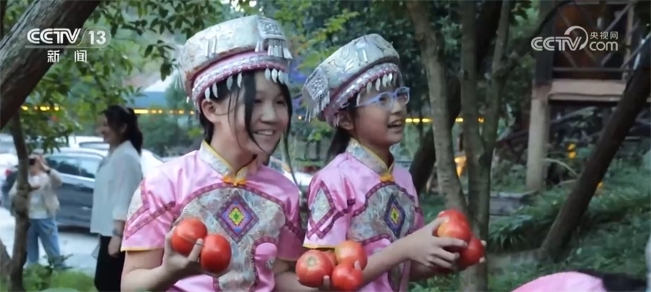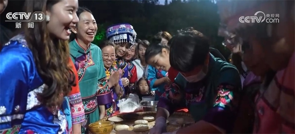 隨著歡快的音樂(lè)響起,當(dāng)?shù)卮迕翊┥仙术r艷的節(jié)日盛裝,踏著鼓點(diǎn),圍著篝火跳起土家擺手舞,豐收的喜悅洋溢在村民們的臉上,游客們加入其中,大家手牽著手,共同舞出金秋和美鄉(xiāng)村新畫(huà)卷。