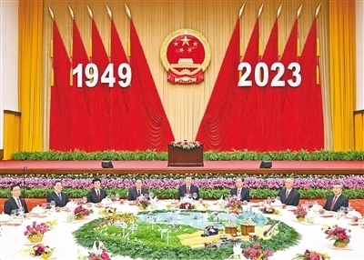 人民大會(huì)堂宴會(huì)廳華燈璀璨、鮮花綻放,洋溢著喜慶熱烈的節(jié)日氛圍。主席臺(tái)上方高懸著莊嚴(yán)的國徽,“1949—2023”大字年號在鮮艷的紅旗映襯下格外醒目。