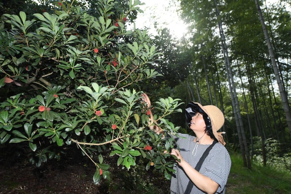 在浙江省仙居縣廣度鄉(xiāng)瓦垚頭村,浙江大學(xué)環(huán)境與資源學(xué)院教授吳良?xì)g結(jié)對(duì)指導(dǎo)的村民鄭文娟在查看楊梅長(zhǎng)勢(shì)(7月4日攝)。新華社記者 翁忻旸 攝