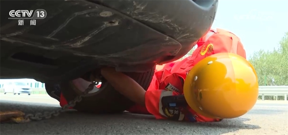 兩人將鐵鏈和拖車鉤工具套在故障車前底盤,但這得鉆進車底,貼地操作。中午的高速柏油路面氣溫已經(jīng)逼近60℃,發(fā)燙的路面和陣陣熱浪讓人滿身灼熱感。隨后,兩人通過卷揚機將故障車牽引到救援車上,再逐一固定好故障車的四個輪胎。高溫下在高速露天作業(yè),他倆的頭發(fā)上不斷甩出汗珠。