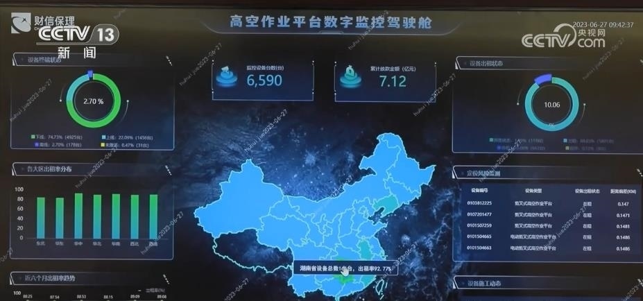 在湖南這家金融機構(gòu)的大屏幕上,一個個小點組成了全國6500多臺高空作業(yè)設(shè)備的實時運行數(shù)據(jù)圖。動動手指,生產(chǎn)的每臺設(shè)備的地理位置、開機狀態(tài)和運行情況等數(shù)據(jù)都清晰可見。